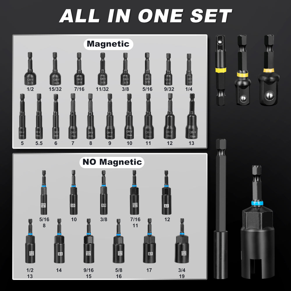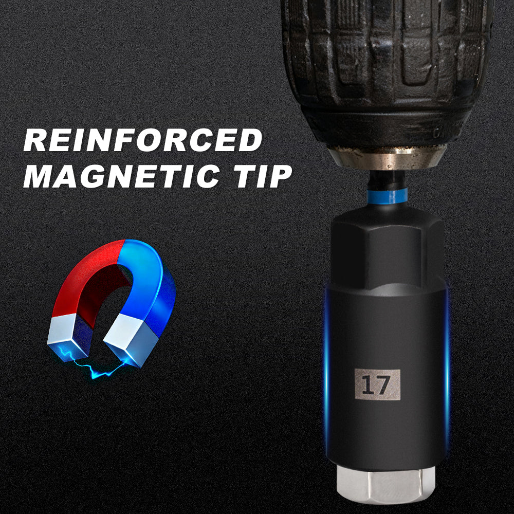 POWERFUL & TARGETED MAGNETISM - Features 18 industrial-grade magnetic sockets (Sizes: 1/4", 5/16", 9/32", 11/32", 3/8", 7/16", 1/2", 15/32", 5, 5.5, 6, 7, 8, 9, 10, 11, 12, 13mm) that securely hold fasteners in place, preventing drops and simplifying work in tight spaces or on elevated surfaces.