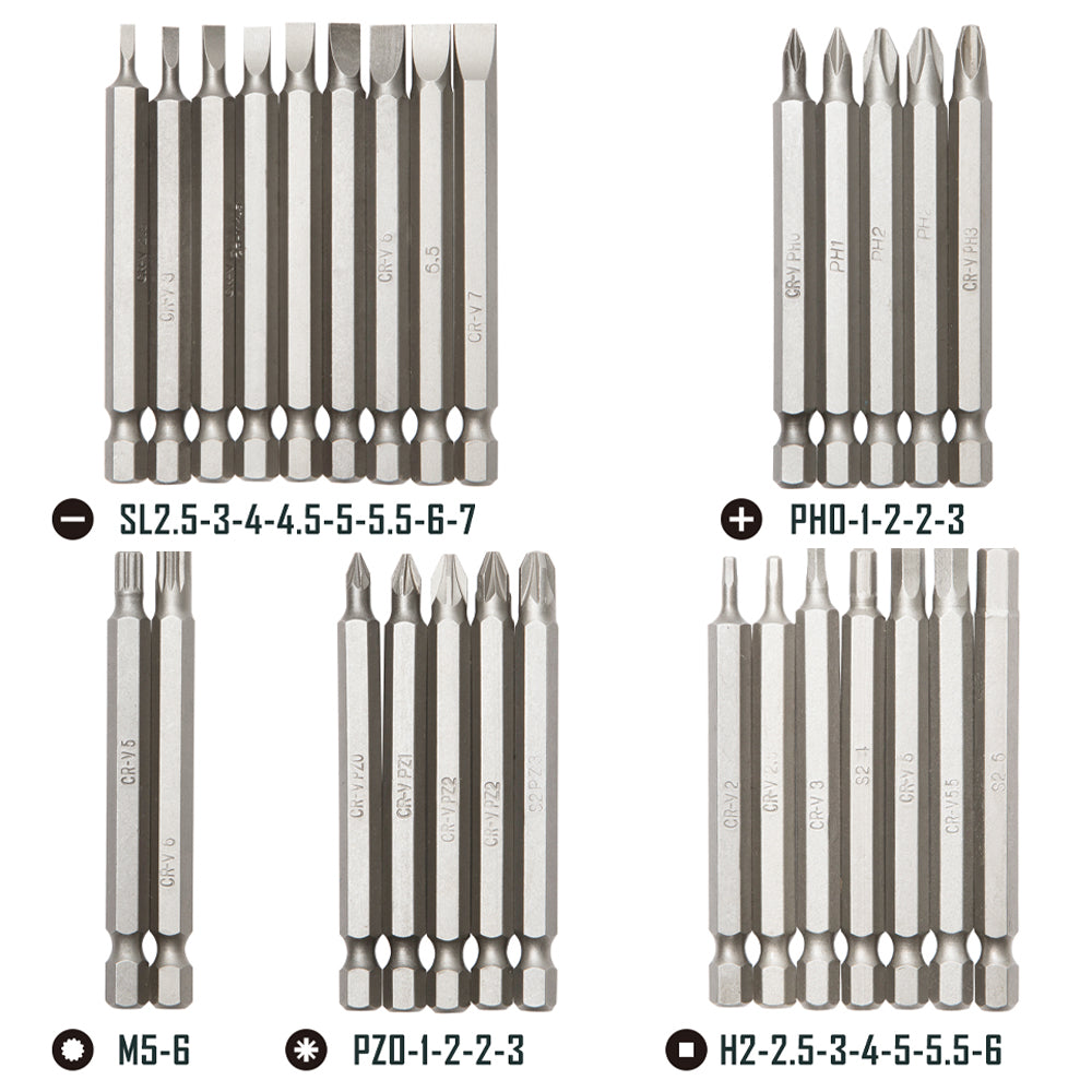 M5, M6; H2, H2.5, H3, H4, H5, H5.5, H6; SL2.5, SL3, SL4, SL4.5, SL5, SL5.5, SL6, SL6.5, SL7; T8, T10, T15, T20, T25, T27, T30, T40; PZ0, PZ1, PZ2, PZ2, PZ3; PH0, PH1, PH2, PH2, PH3