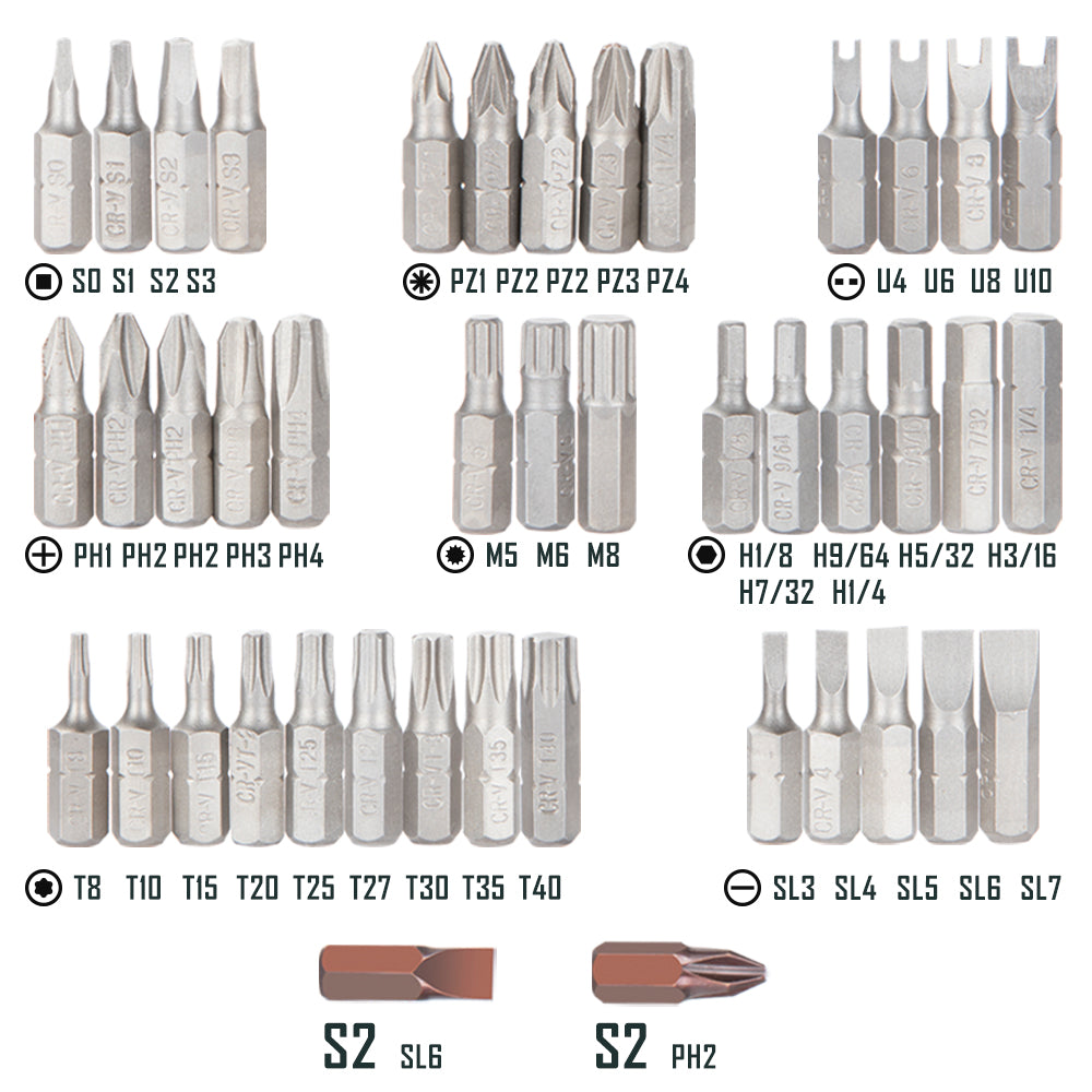 CR-V Steel Bits: 5 Pieces Pozi Bit (PZ 1, 2, 2, 3, 4); 5 Pieces Phillips Bit (PH 1, 2, 2, 3, 5); 5 Pieces Slotted Bits (SL 3, 4, 5, 6, 7); 6 Pieces Hex Bits (H 1/8, 9/64, 5/32, 3/16, 7/32, 1/4); 9 Pieces Torx/Star Bits (T 8, 10, 15, 20, 25, 27, 30, 35, 40); 4 Pieces Square Bits (S 0, 1, 2, 3); 3 Pieces M Bits (M 5, 6, 8); 4 Pieces U Bits (U 4, 6, 8, 10).