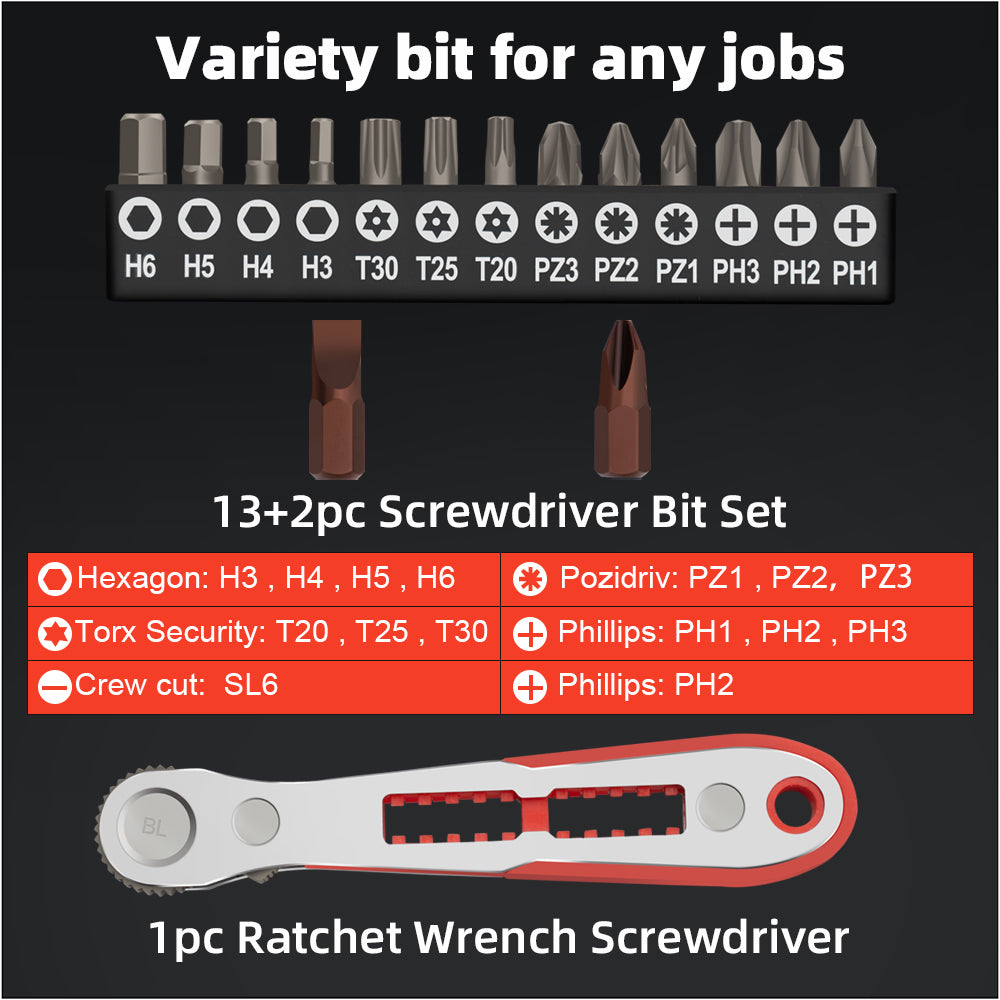 - Set Includes: 15pc bits, including H3, H4, H5, H6; T20, T25, T30; PZ1, PZ2, PZ3; PH1, PH2, PH3; SL6; PH2 and a ratchet wrench screwdriver.