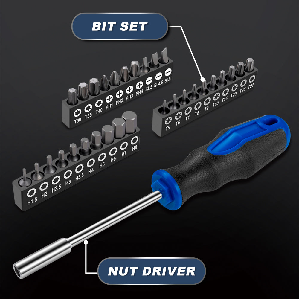 - 31-IN-1 VERSATILITY & COMPATIBILITY: Tackle a vast range of tasks with 31 precision bits (H1.5-H8, T30-T40, PH1-PH4, SL3-SL6) and a magnetic 1/4" nut driver. This comprehensive screwdriver bit set is your ultimate toolkit for electronics, appliances, furniture assembly, and DIY projects, fitting all standard 1/4-inch screwdrivers and impact drivers.