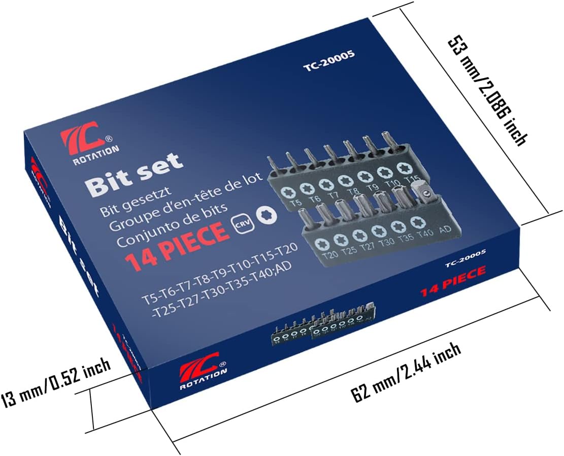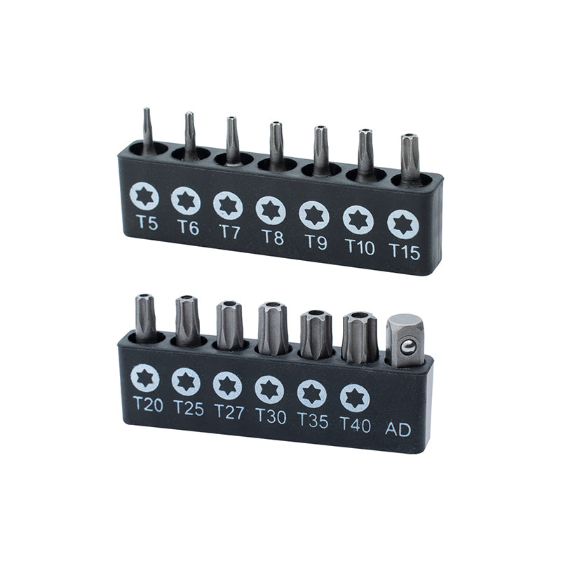 - This set includes 12 tamper proof star bits, 2 standard star bits (T5, T6) and 1 AD connector.