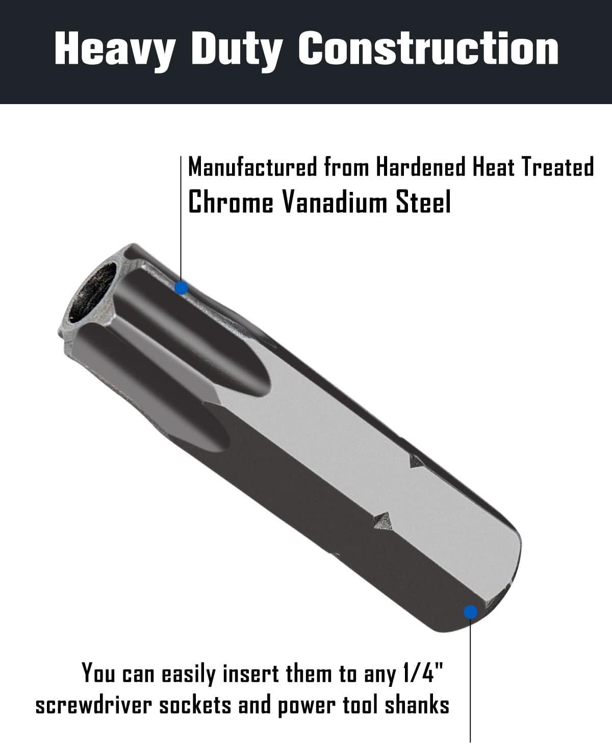 - Made of high quality CRV steel, with sturdy hardened and tempered construction, perfectly matched to standard and tamper evident torx/star 6-point screws.